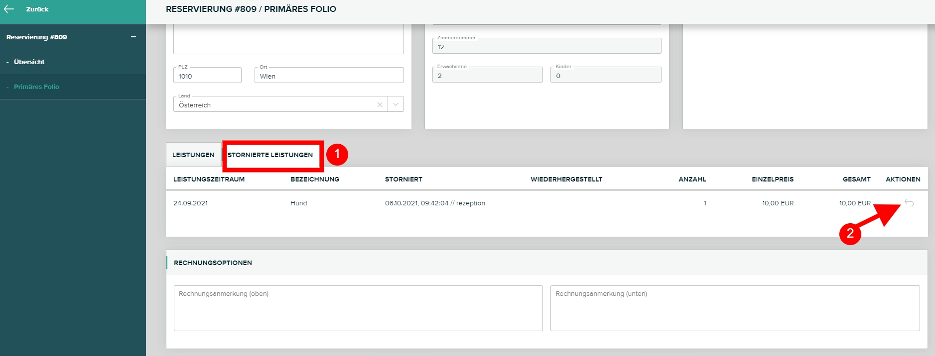 Öffnen Sie das Folio und klicken Sie auf den Tab Stornierte Leistungen. Klicken Sie rechts auf das Zeichen Storno rückgängig machen (d.h. diese Leistung wieder dem aktuellen Folio hinzufügen)