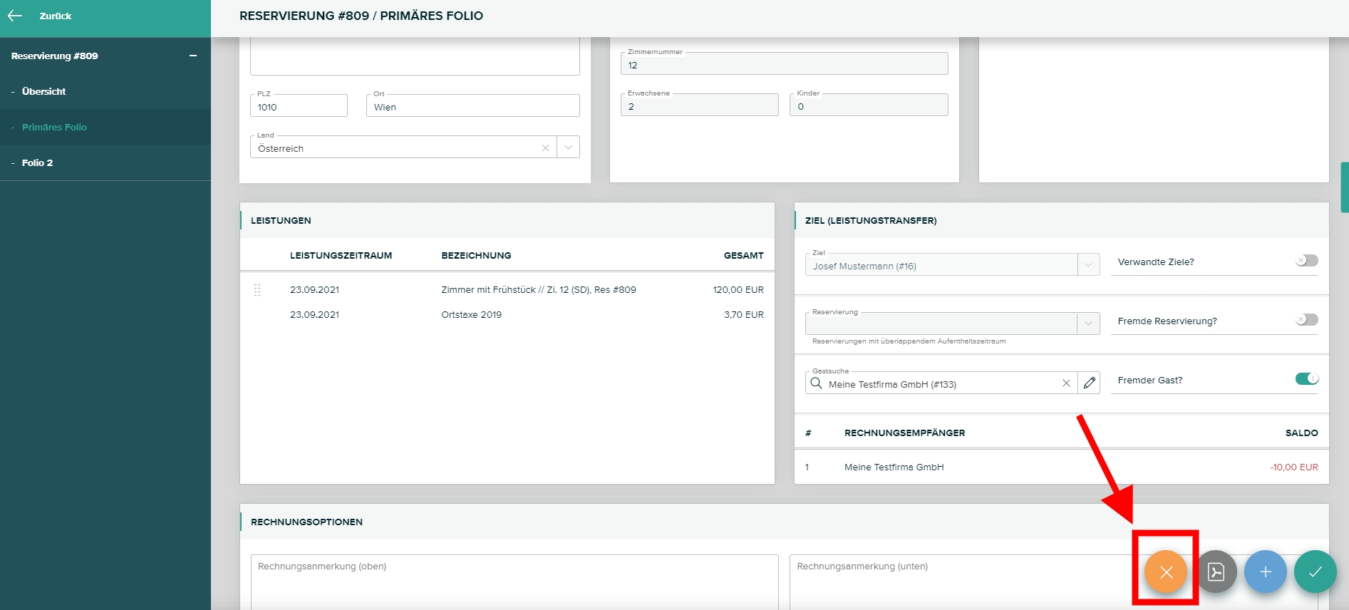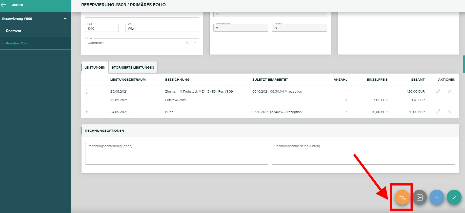 Öffnen Sie die Reservierung und das gewünschte Folio. Klicken Sie rechts unten auf Transfer Modus