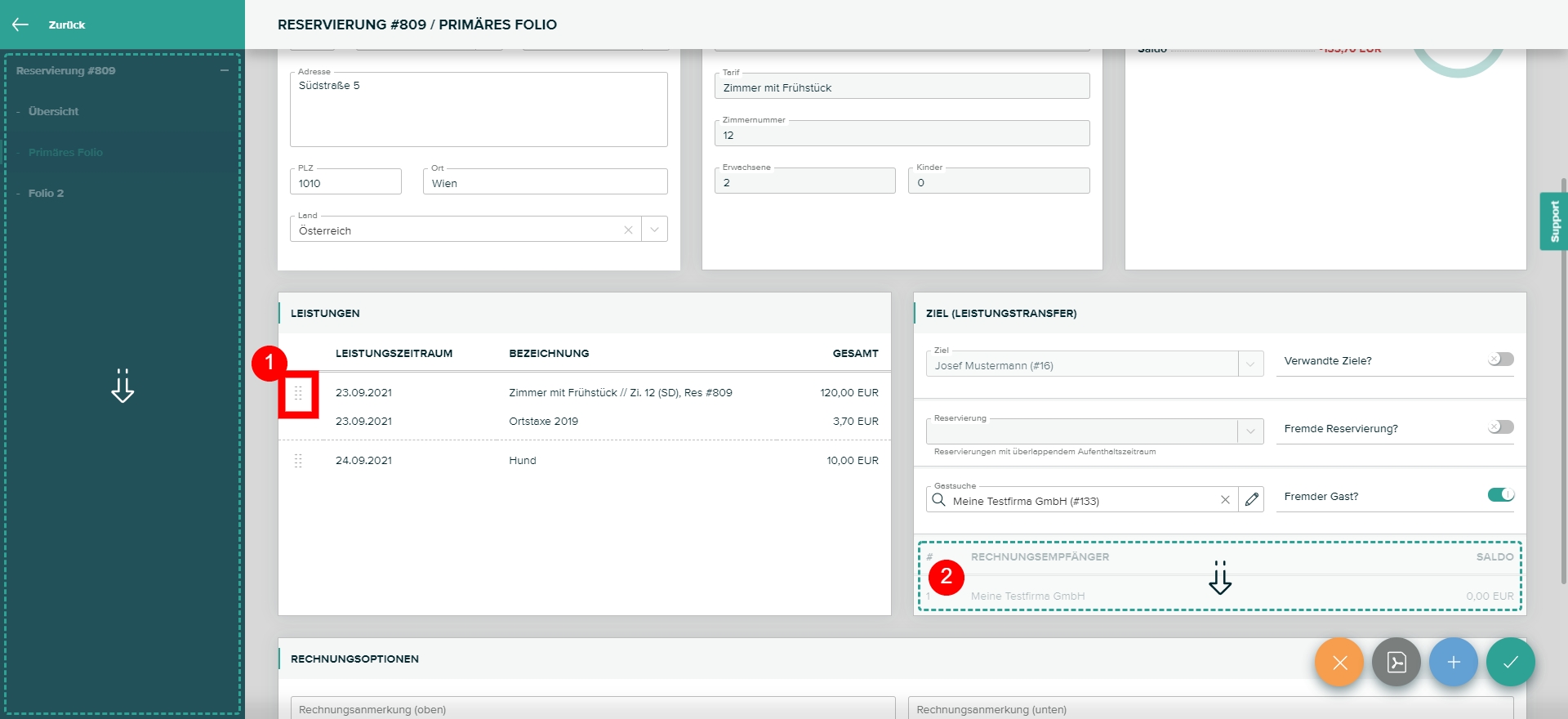 Klicken Sie nun auf die Zeichen mit den 6 Punkten links neben der Leistung (siehe Abbildung Pkt. 1). Halten Sie die linke Maustaste gedrückt und ziehen sie die Leistung in das Feld Rechnungsempfänger (siehe Abbildung Pkt. 2)