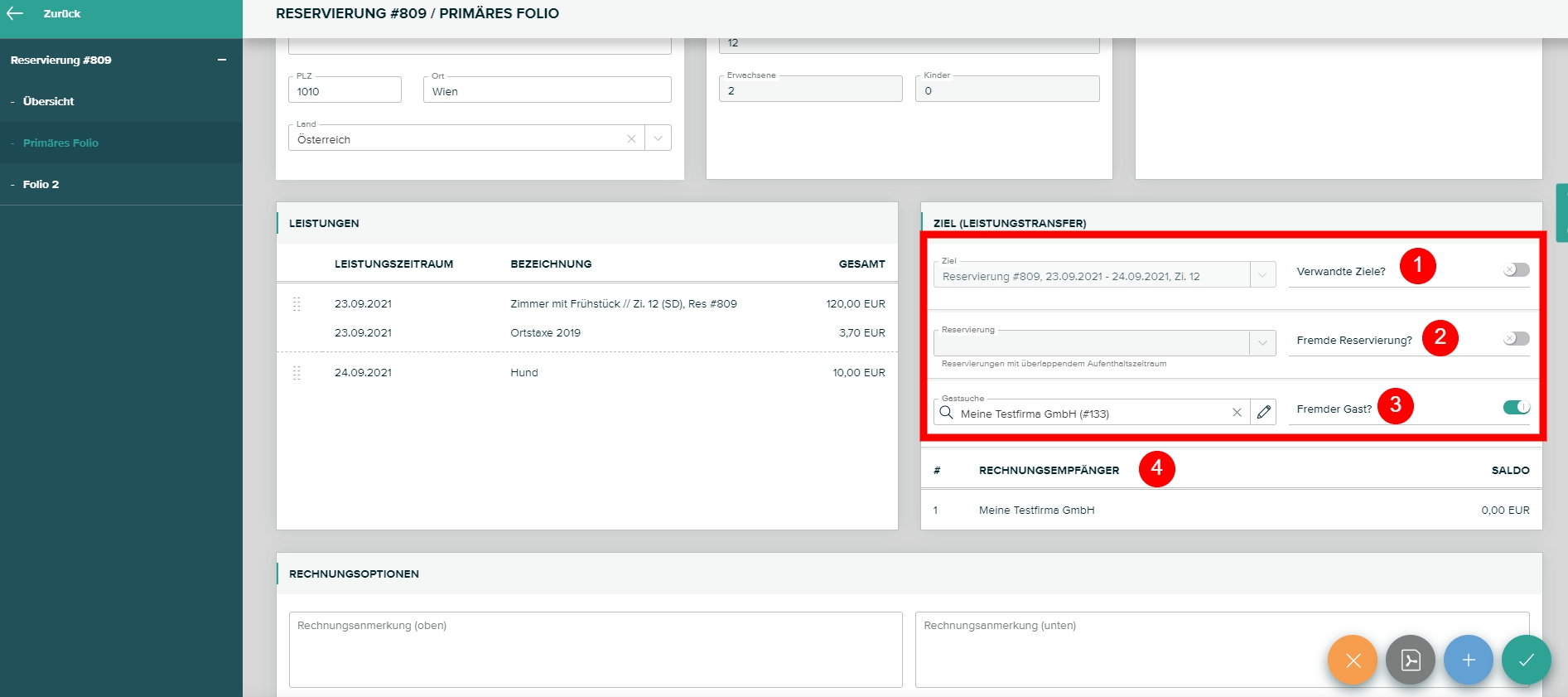 Sie haben folgende Möglichkeiten einen neuen Rechnungsempfänger auszuwählen (siehe auch Abbildung) Punkt1: Verwandte Ziele - Hier werden weitere Reservierungen des Gastes angezeit. Punkt 2: Fremde Reservierung - Hier werden Reservierungen mit überlappenden Aufenthaltszeitraum angezeigt. Punkt 3: Fremder Gast - Hier können Sie nach jedem beliebigen Gast, Firma oder Reisebüro suchen.