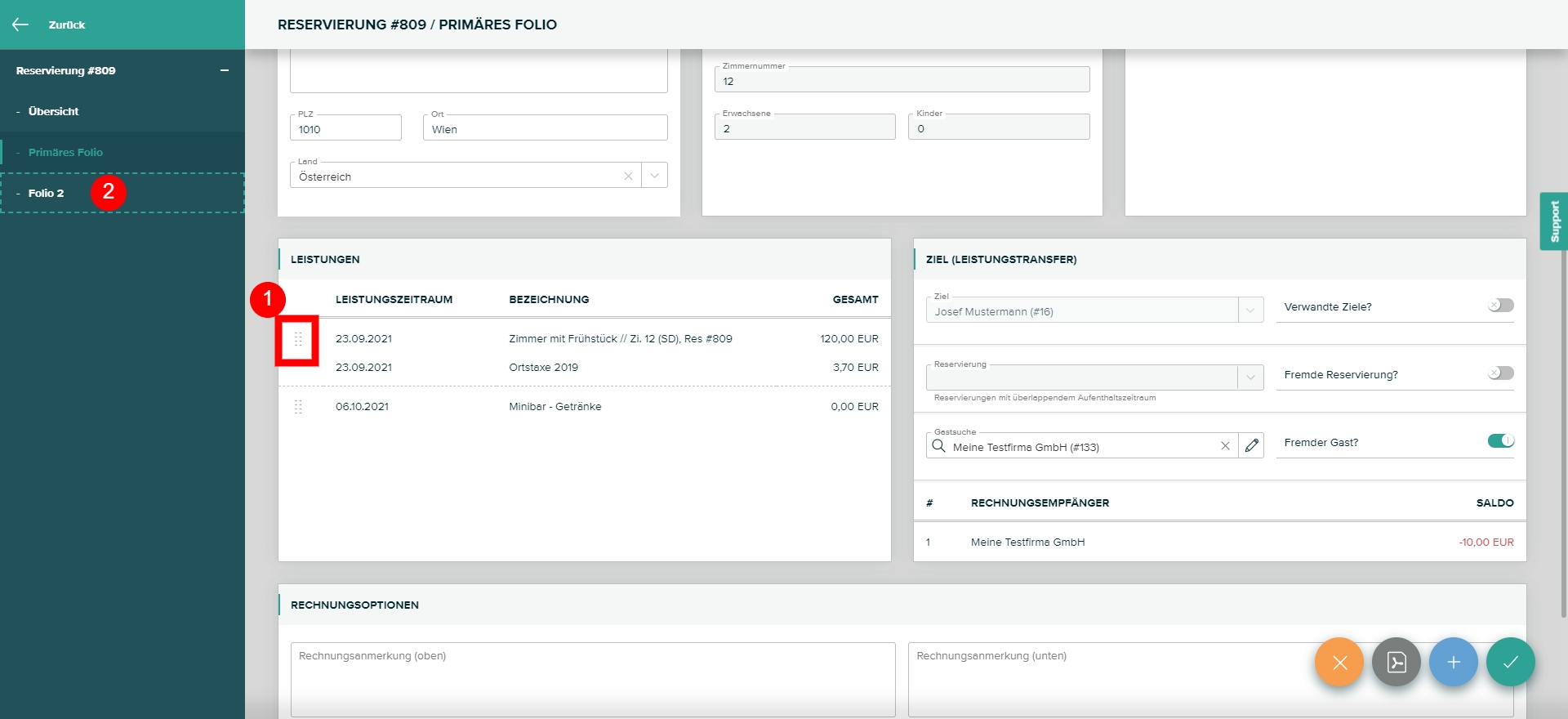 Öffnen Sie die Reservierung und das gewünschte Folio. Klicken Sie rechts unten auf Transfer Modus