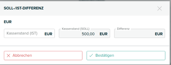 Zählen Sie nun bitte den tatsächlichen Bargeldbestand in der Kasse und geben diesen in das Feld "Kassenstand (IST)" ein.