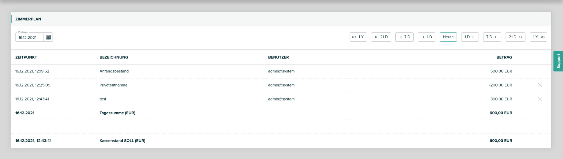 Das Kassenbuch kann in der Hotelsoftware geführt werden um auch andere Barbewegungen (z.B. Barentnahmen oder Bareinlagen) zu dokumentieren. Dadurch ist außerdem die Kassensturzfähigkeit zu jeder Zeit sichergestellt.