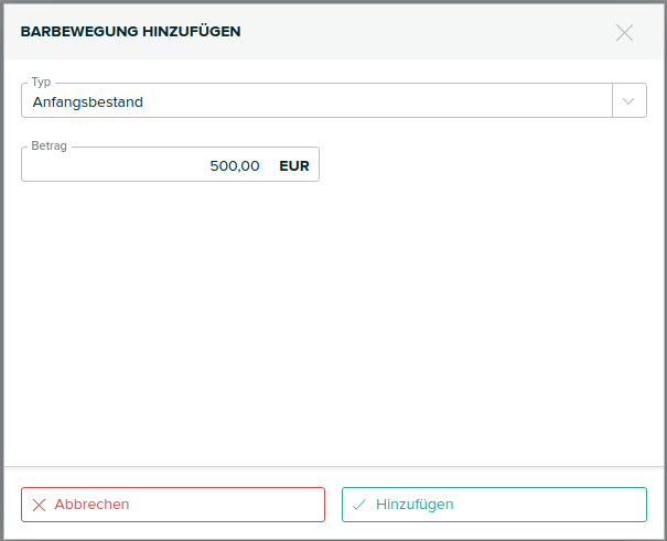 Wählen Sie nun bei Typ Anfangsbestand aus und geben Sie den aktuellen Bargeldbestand in der Kassa ein.