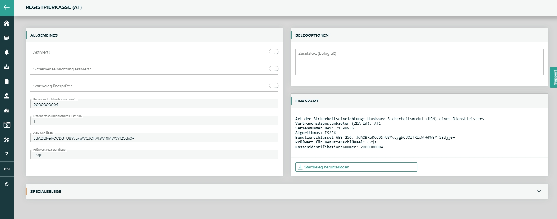 In dieser Sektion kann man ob die Registrierkasse inkl. Sicherheitseinrichtung ordnungsgemäß in Betrieb genommen wurde und mit welchen Parametern (DEP, AES Schlüssel, Kassen ID).