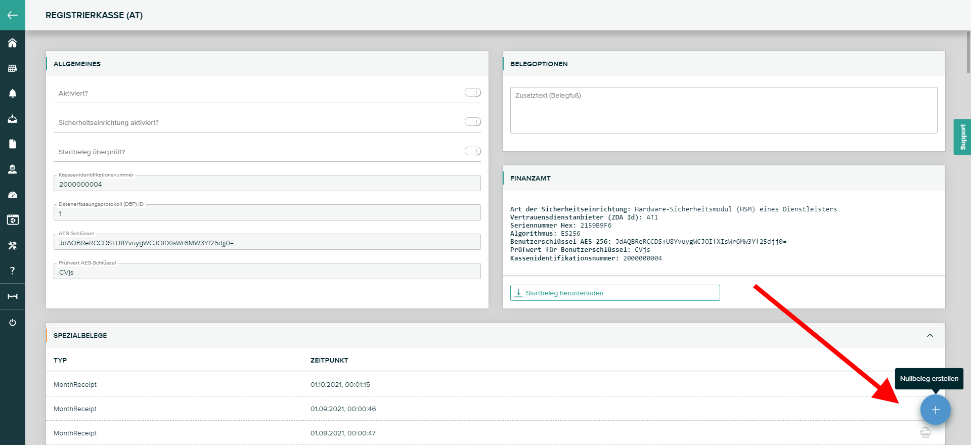 Öffnen Sie den Menüpunkt Einstellungen > Registrierkasse und klicken Sie rechts unten auf "Nullbeleg erstellen"