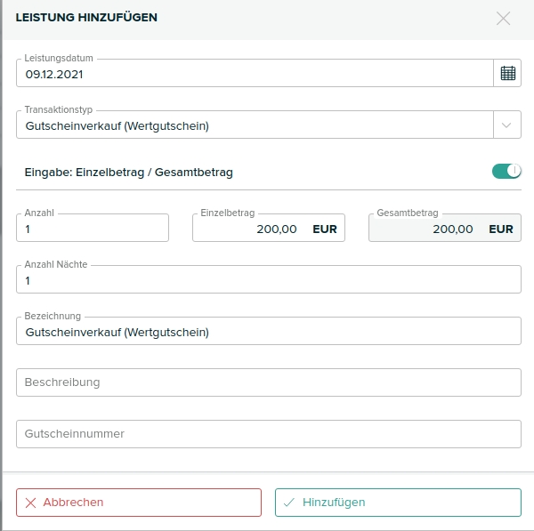 Fügen Sie die Leistung für den Gutscheinkauf hinzu (siehe ) und geben Sie zusätzlich noch das Feld Gutscheinnummer an (dieses Feld wird nur angezeigt wenn der Fiskalisierungstyp der Zusatzleistung richtig ausgewählt wurde).