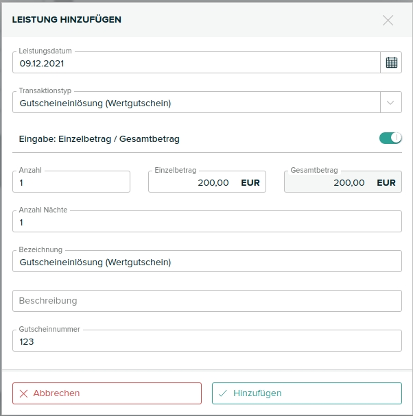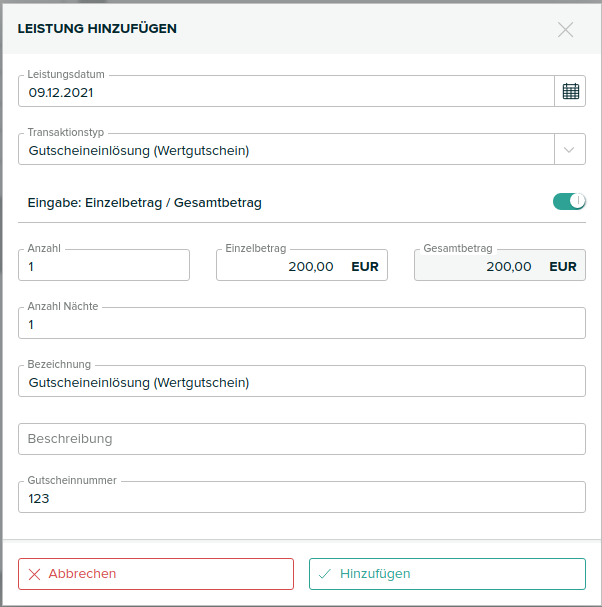 Fügen Sie die Leistung für die Gutscheineinlösung hinzu (siehe ) und geben Sie zusätzlich noch das Feld Gutscheinnummer an (dieses Feld wird nur Angezeigt wenn der Fiskalisierungstyp der Zusatzleistung richtig ausgewählt wurde). Bitte beachten Sie, dass die Gutscheinnummer nicht auf Gültigkeit überprüft wird.