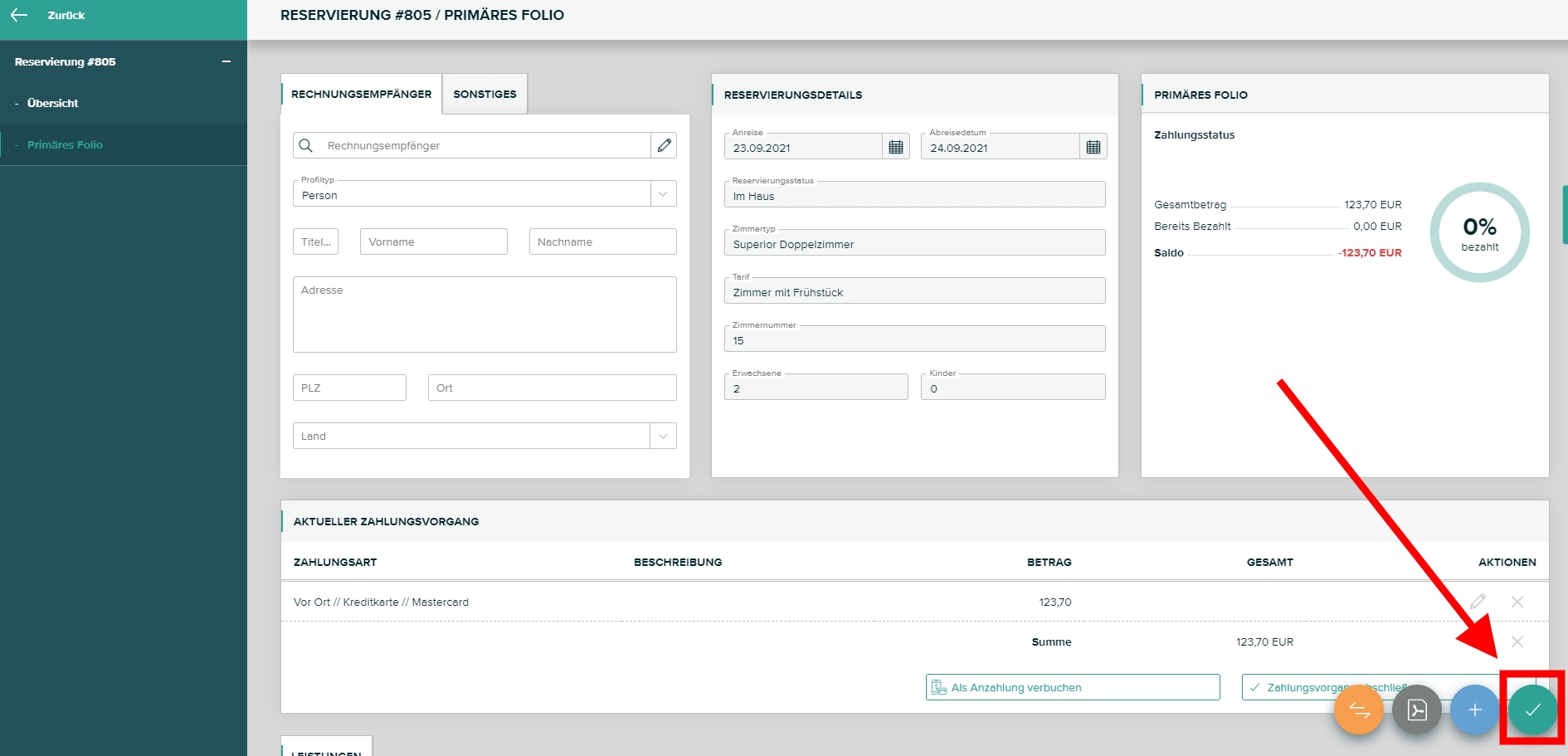 Um eine Rechnung zu erstellen wählen Sie das gewünschte Folios aus und klicken Sie anschließend auf den Knopf "Rechnung erstellen" (im Screenshot rot markiert).