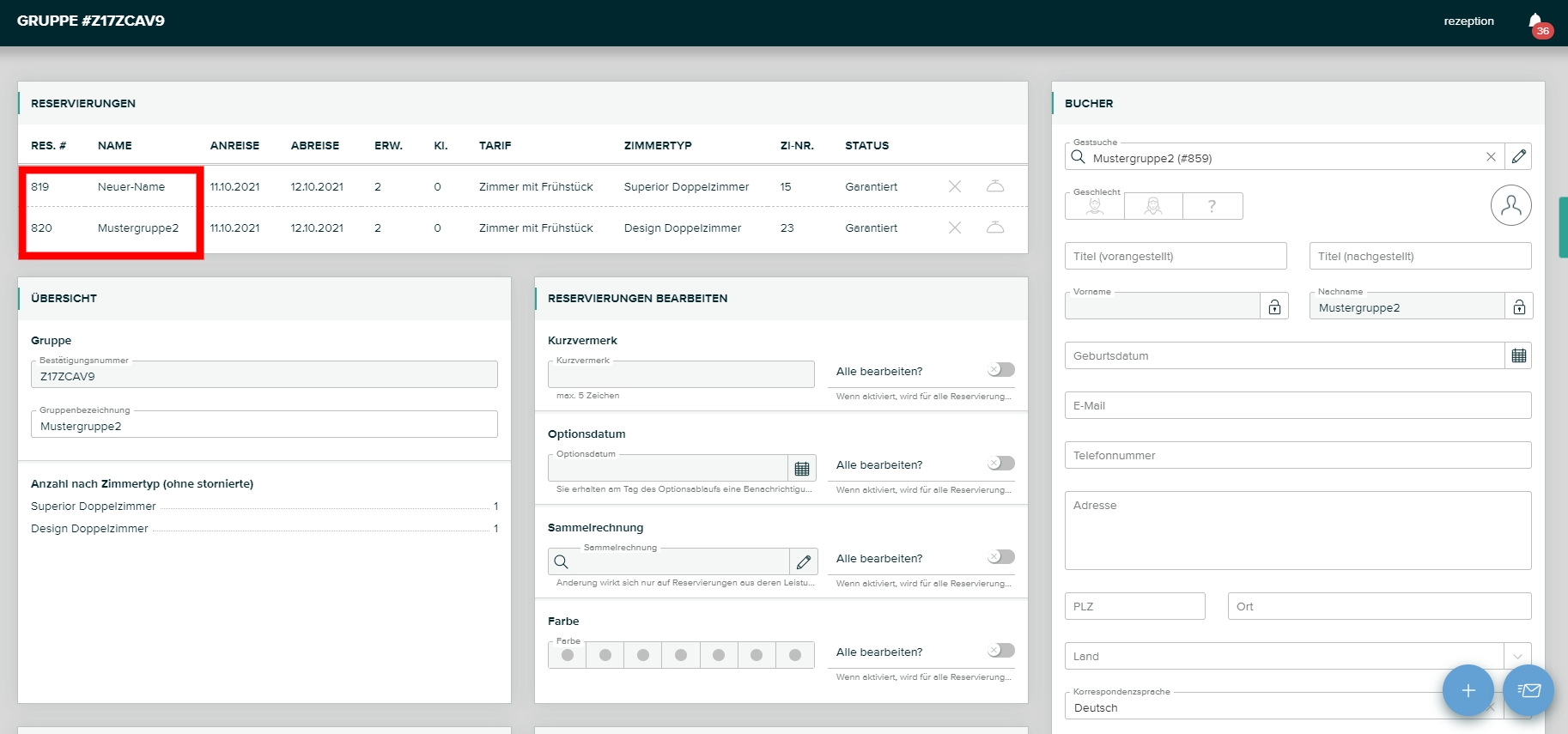 Hier sehen Sie die Übersicht der Gruppenreservierung, wobei nun eine Reservierung mit dem nachträglich geänderten Namen aufscheint und eine Reservierung mit dem ursprünglichen Namen.