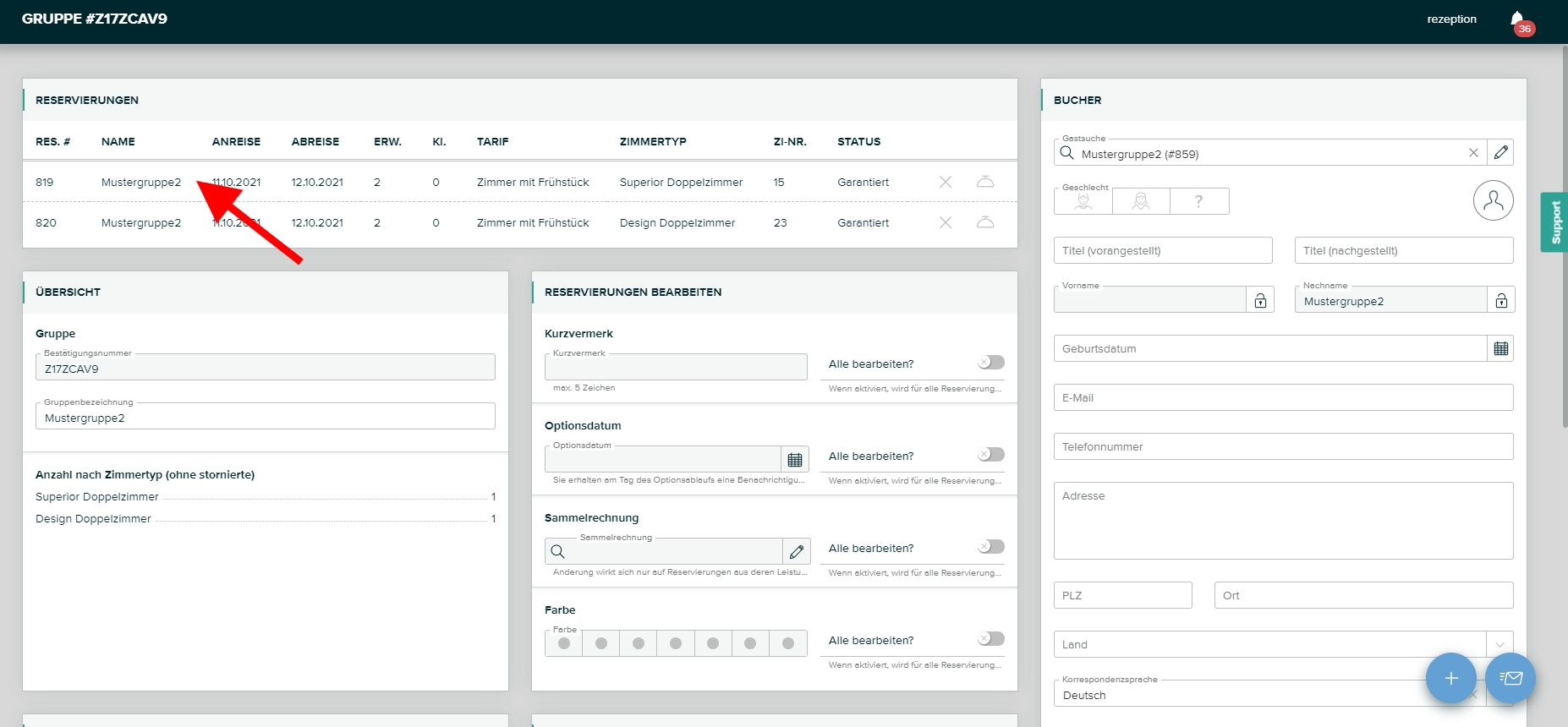 Klicken Sie links auf die Bestätigungsnummer der Gruppenreservierung.