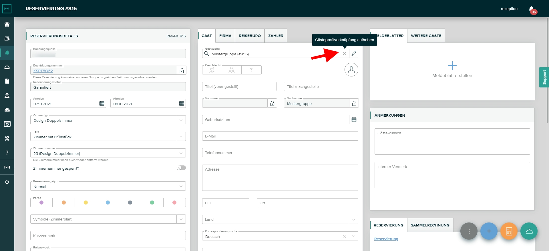 Wenn die Reservierung auf einen neuen Gastnamen lauten sollte, klicken Sie NICHT auf bearbeiten, da ansonsten das Gästeprofil des Gastes der gebucht hat überschrieben wird. Klicken Sie auf Gästeprofilverknüpfung aufheben.