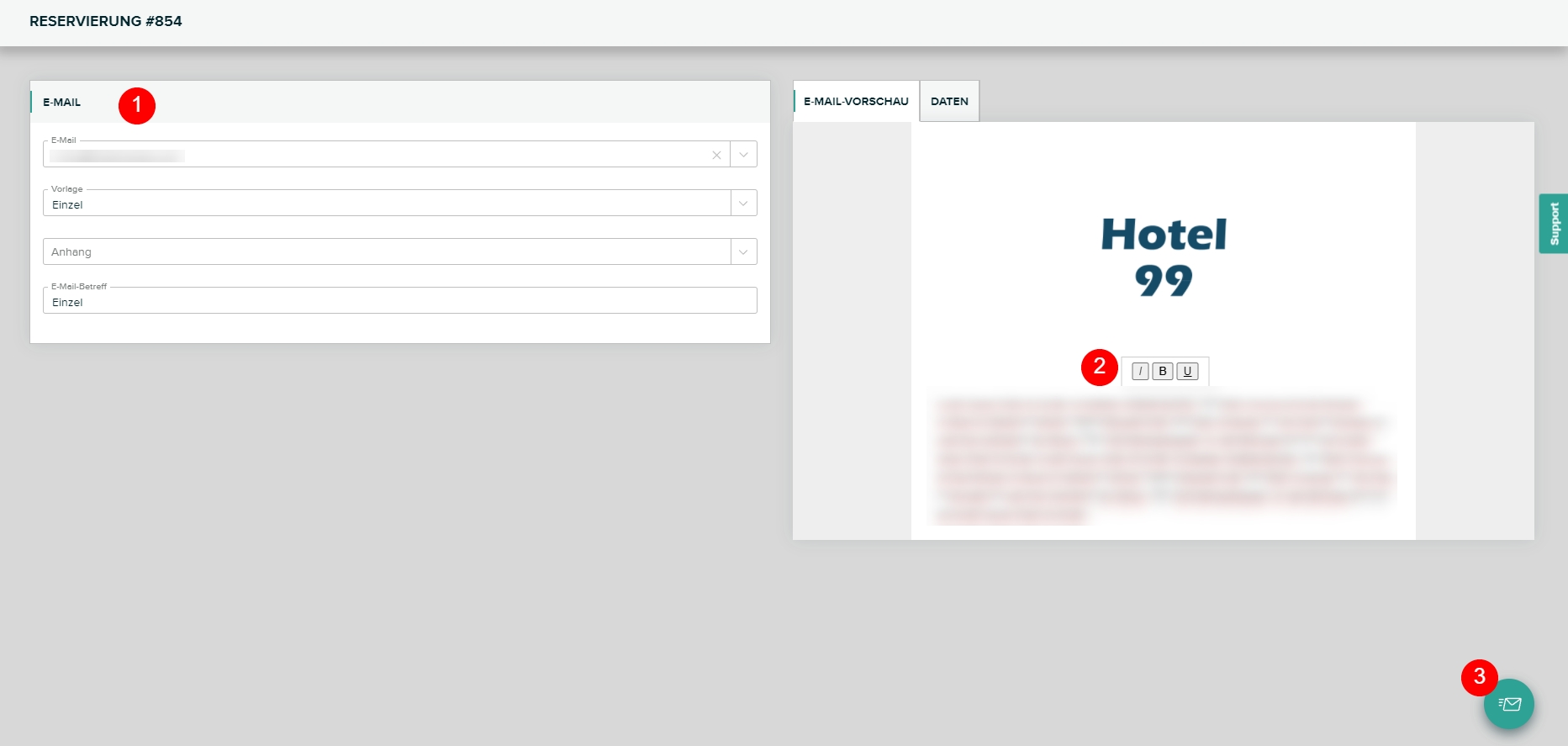 Wenn alle Eingaben korrekt sind, klicken Sie bitte rechts unten auf E-Mail senden (siehe Pkt. 3). Wenn die E-Mail erfolgreich versendet wurde, werden sie wieder auf das vorherige Objekt (z.B. Reservierung, Angebot, Gästeprofil) weitergeleitet, wo nun die E-Mail in der Korrespondenz gespeichert wurde. So haben Sie jederzeit die Möglichkeit gesendete E-Mails noch einmal anzusehen.