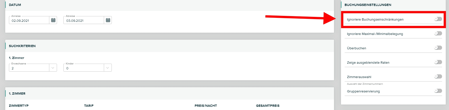Nutzen Sie dafür bitte die normale Reservierungsfunktion und wählen Sie die Option "Ignoriere Buchungseinschränkungen" aus. In diesem Fall werden auch Raten angezeigt die z.B. durch einen Mindest- oder Maximalaufenthalt nicht buchbar wären oder Zeiträume in denen keine Saisonszeiten gesetzt wurden.