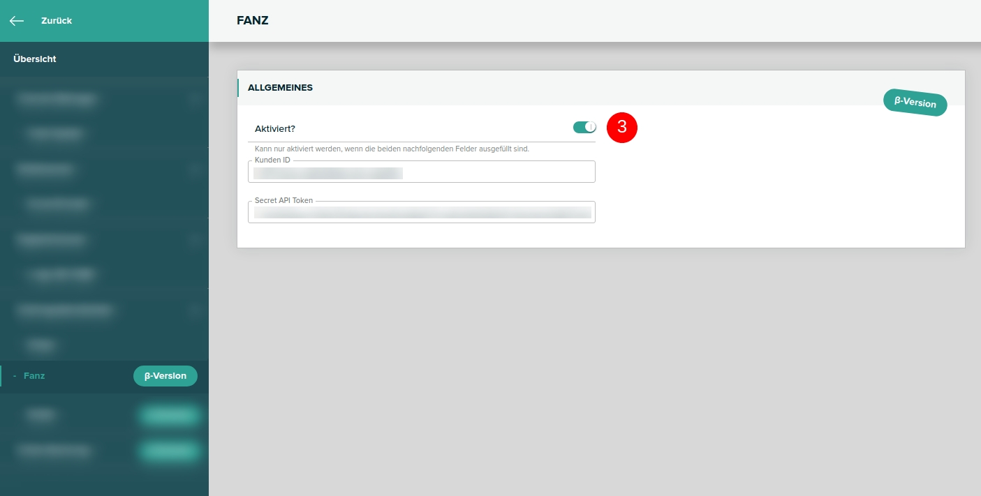 Bleiben Sie auf den Schnittstellen Einstellungen für Fanz in der Hotelsoftware (Einstellungen > Schnittstellen > Fanz)
