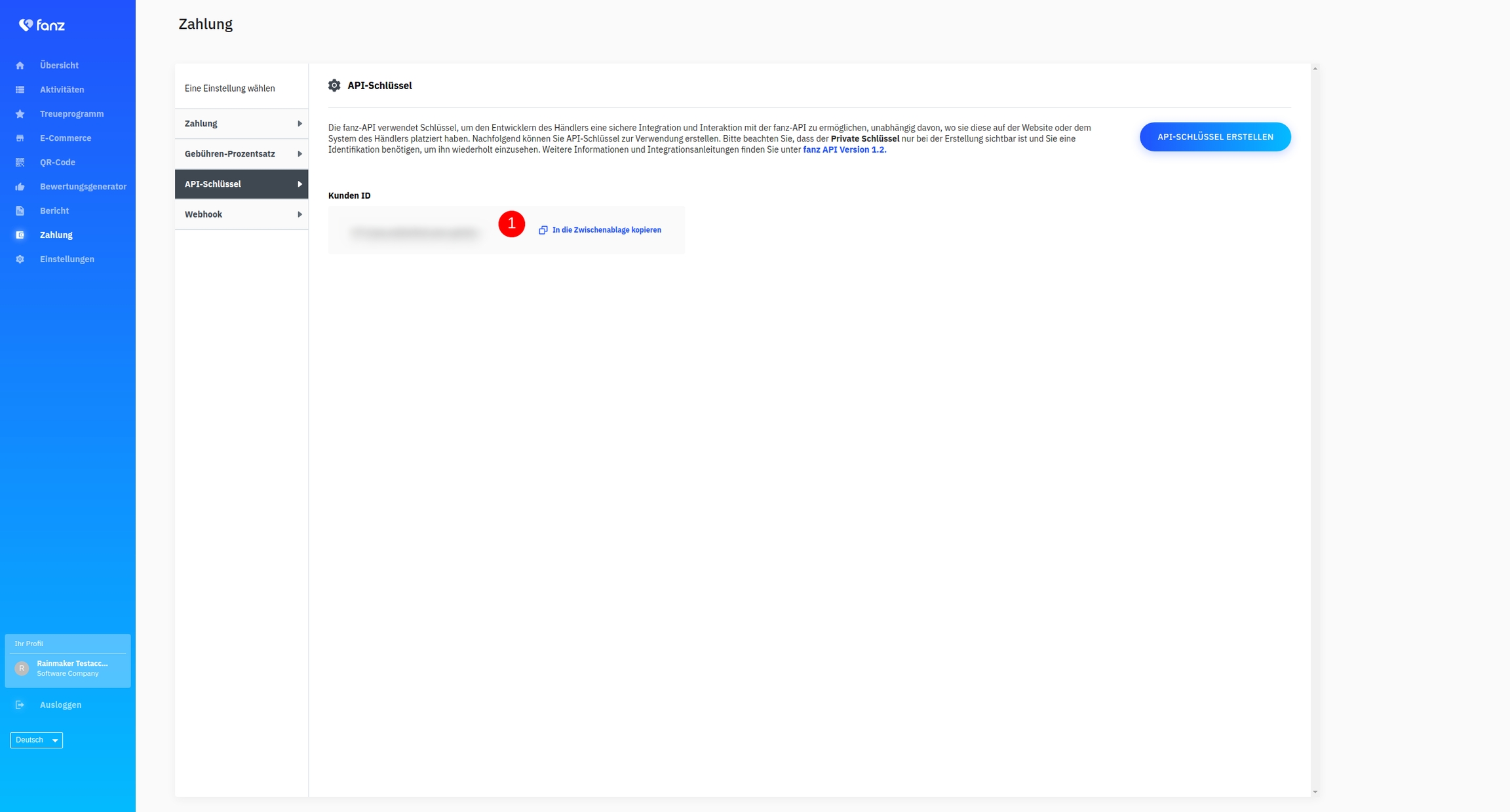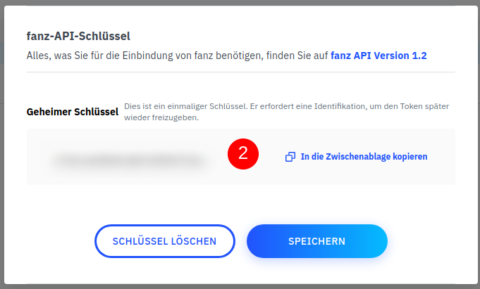 Erstellen Sie nun in Fanz einen API-Schlüssel (2) und kopieren diesen in das Feld Secret API Token in der Hotelsoftware.