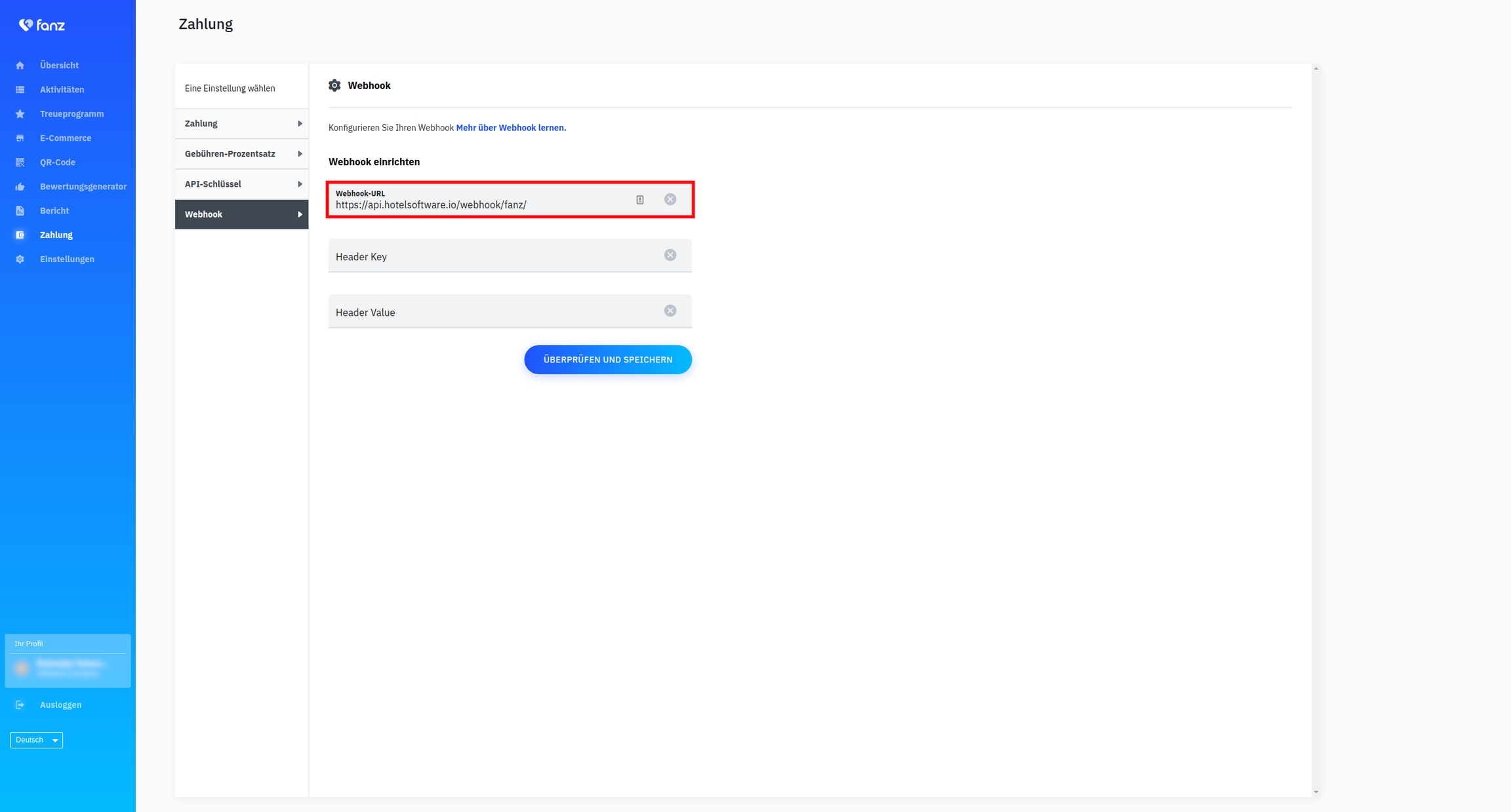 Geben sie im Fanz bitte folgende URL als Webhook-URL ein: https://api.hotelsoftware.io/webhook/fanz/
