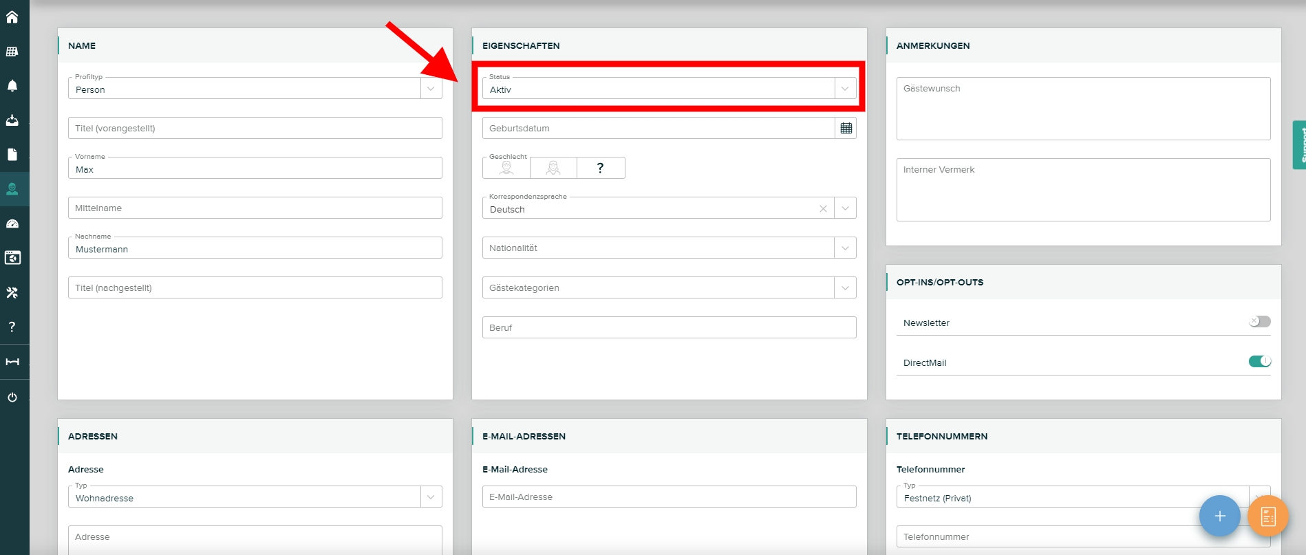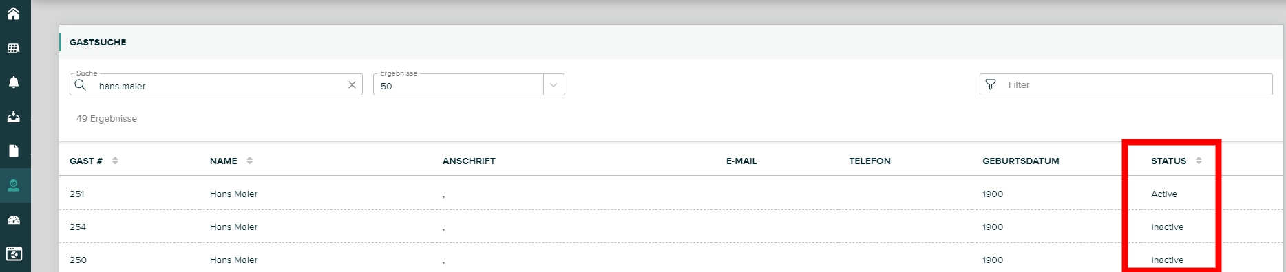 Falls zum Beispiel irrtümlich mehrere Gästeprofile eines Gastes angelegt wurden können Sie die Duplikate auf inaktiv setzen.