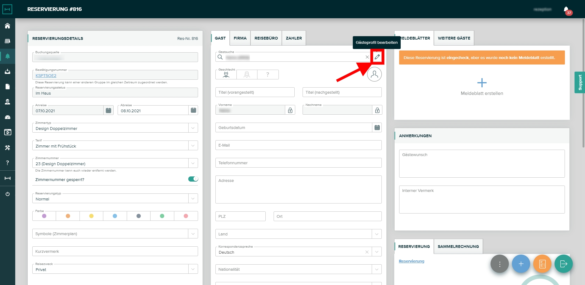 Öffnen Sie die gewünschte Reservierung oder das Angebot. Klicken Sie auf den Button "Gästeprofil öffnen" (siehe Abbildung)