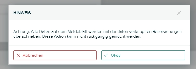 Klicken Sie nun auf Okay, wenn Sie die Daten auf dem Meldeblatt nun mit den Daten der verknüpften Reservierung überschreiben möchten.