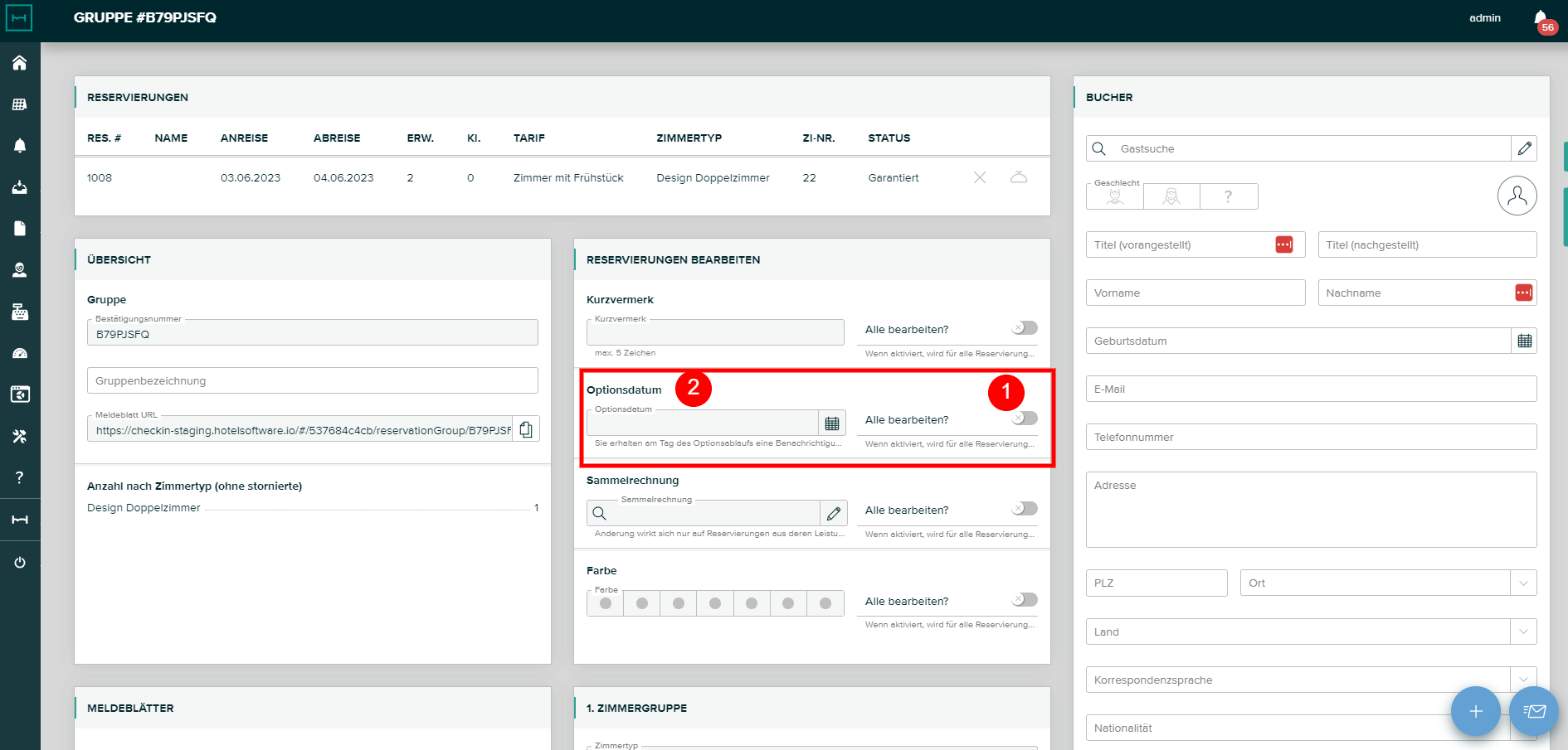 2) Nach Erstellung der Reservierung finden Sie auf der Übersichtsseite den Bereich "Reservierung bearbeiten". Hier aktivieren Sie das Feld Optionsdatum (siehe Pkt. 1) und geben das gewünschte Datum ein (siehe Pkt. 2)