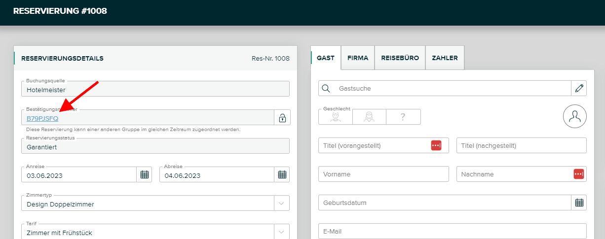Möchten Sie bei einer bereits erstellen Reservierung ein Optionsdatum hinzufügen. Öffnen Sie die gewünschte Reservierung und klicken Sie auf dei Bestätigungsnummer (siehe Bild). Danach gelangen Sie ebenfalls auf die Reservierungsübersicht.