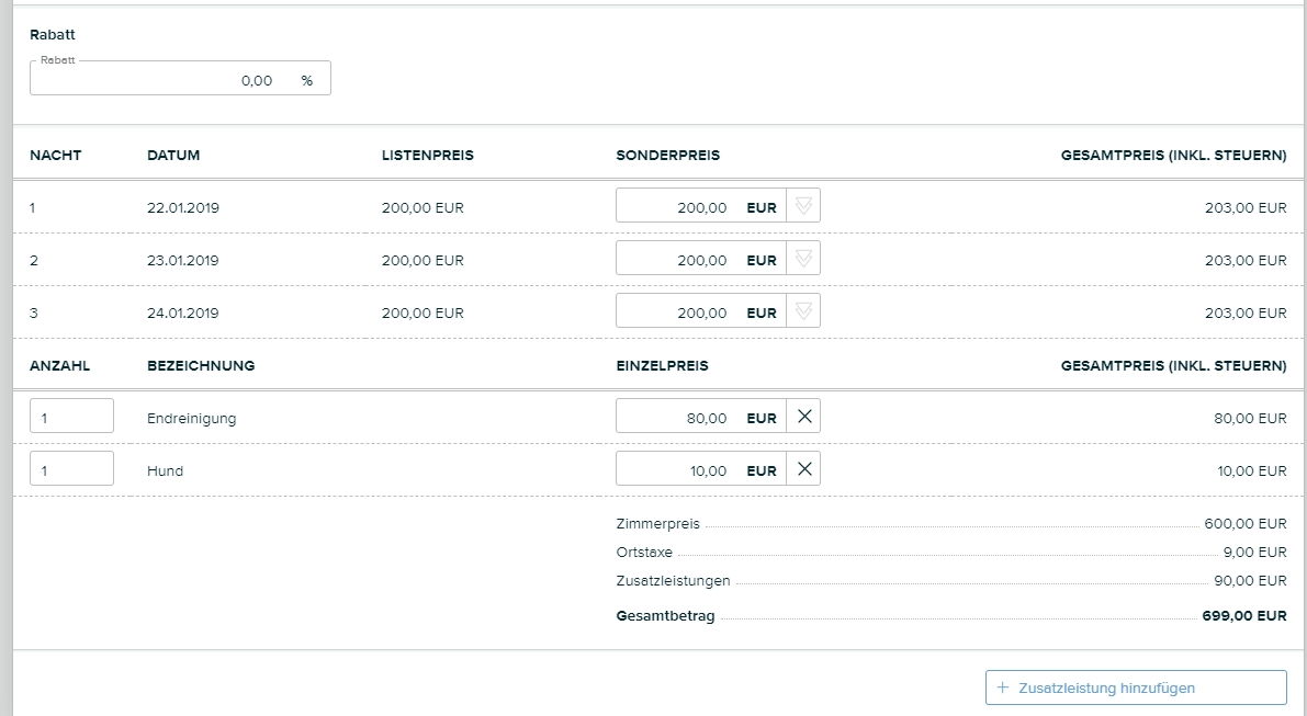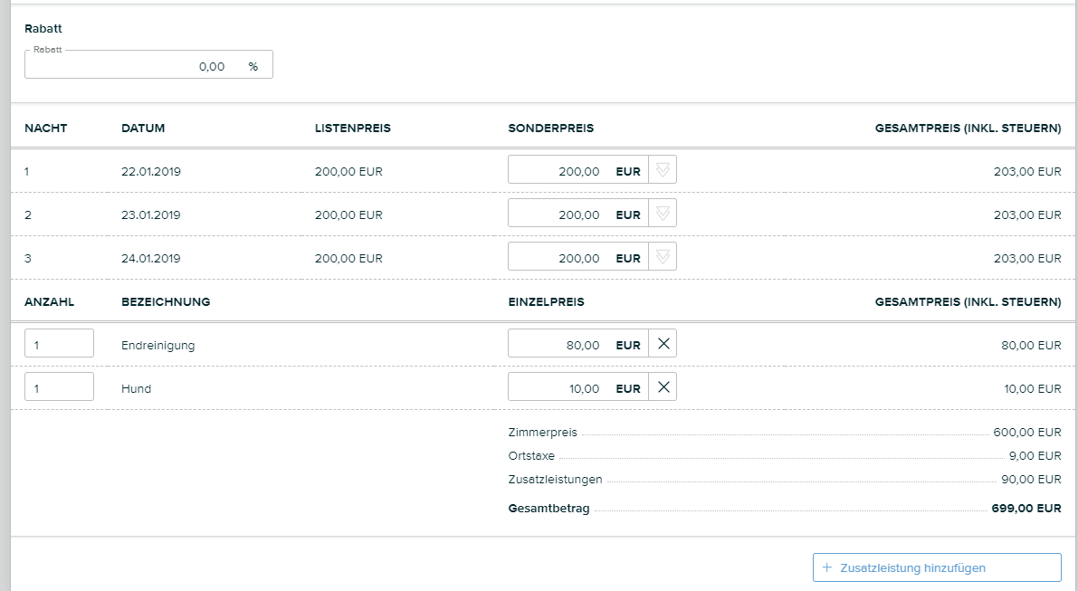 Unter den Nächten finden Sie die Zusatzleistungen angeführt. Mithilfe des Buttons Zusatzleistung hinzufügen, können Sie eine neue Leistung hinzufügen.