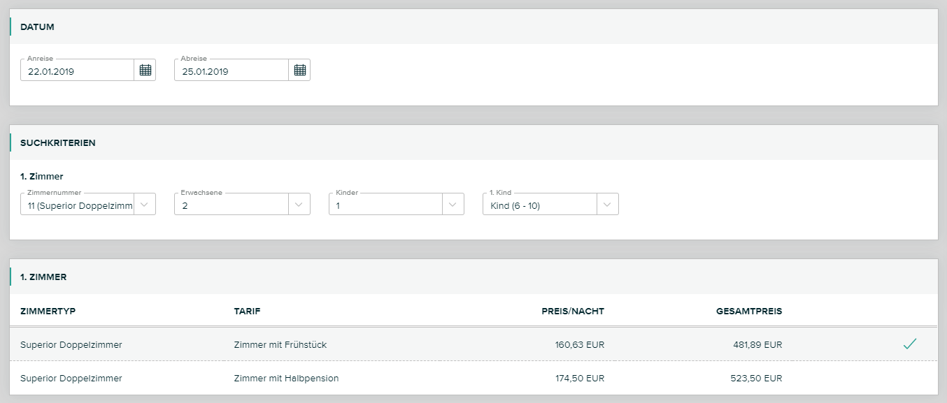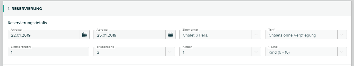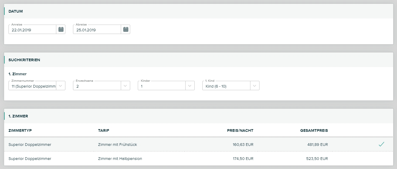 Danach werden die Eckdaten wie Datum, Zimmer, Personenanzahl und Zimmertyp angezeigt und können bei Bedarf abgeändert werden.