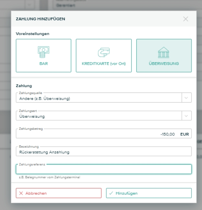 Wählen Sie die Zahlungsquelle und Zahlungsart aus, mittels der Sie die Anzahlung der Gäste nun rückerstatten möchten. Falls die Anzahlung des Gastes 150 EUR betragen hat, geben Sie nun diesen Betrag negativ, also mit Minuszeichen davor ein, also -150 EUR, da es sich um eine Rückerstattung handelt.