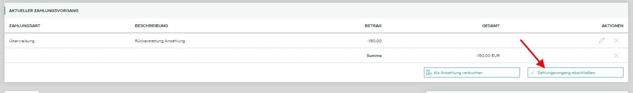 Klicken Sie auf Zahlungsvorgang abschließen! Klicken Sie nicht auf als Anzahlung verbuchen, ansonsten würden Sie eine weitere Anzahlungsrechnung erstellen.