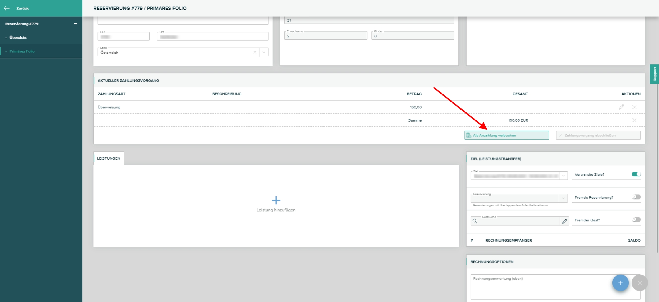 Bitte verbuchen Sie die Zahlung nur als Anzahlung wenn es sich um eine Teilzahlung handelt und Sie den Zahlungsvorgang zum jetzigen Zeitpunkt noch nicht abschließen können, da beispielsweise noch nicht alle Leistungen vom Gast in Anspruch genommen wurden.