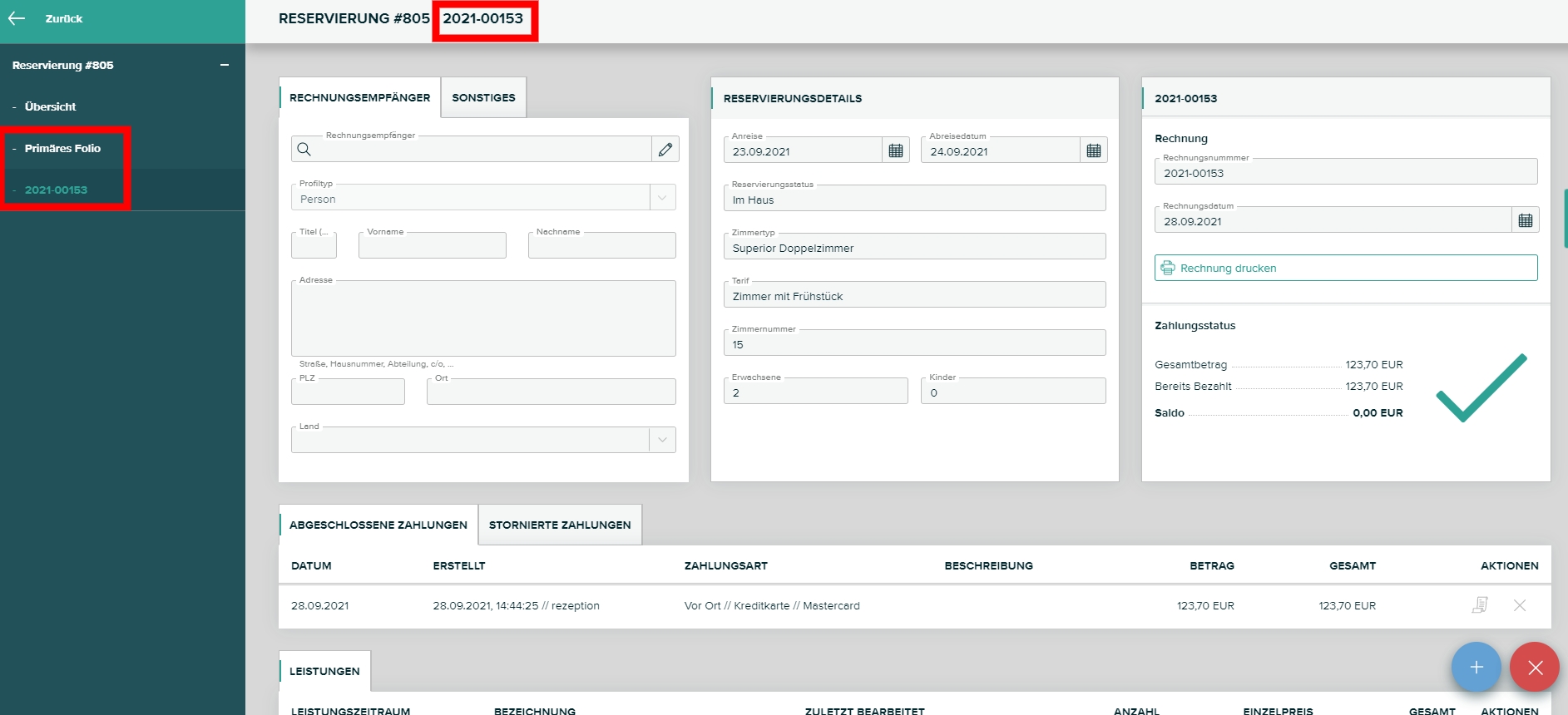 Sie können jederzeit durch den Klick auf einen Tab (im Screenshot mit einem roten Rechteck an der linken Seite markiert) zwischen den einzelnen Folios der Rechnungsansicht hin- und herwechseln. Das momentan ausgewählte Folio wird mit grüner Schrift hervorgehoben, während die anderen Folios eine weiße Schrift haben. Zusätzlich steht ganz oben (ebenfalls im Screenshot mit einem roten Rechteck markiert) nochmal der Name des momentan ausgewählten Folios.