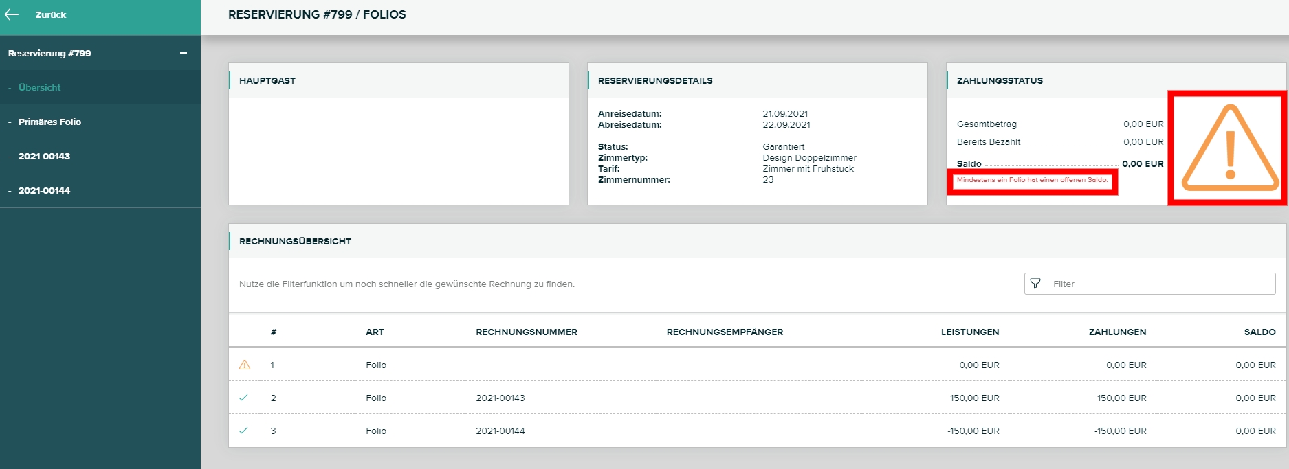 Es könnte z.B. sein, dass Sie auf Rechnung 2021-00144 dem Gast eine Gutschrift in Höhe von 150 € ausgestellt haben, diese jedoch noch nicht ausbezahlt haben. Wenn Sie nun gleichzeitig auf Rechnung 2021-00143 eine Anzahlung in Höhe von 150 € aufgebucht haben, dann ist der Gesamtsaldo 0 € obwohl jedes Folio für sich noch einen offenen Saldo von plus bzw. minus 150 € hat (siehe Warnung in der Abbildung).