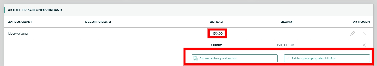 Der Gast hat bereits eine Anzahlung in Höhe von € 150,- bezahlt. Nun kommt es zu einer Stornierung und die Anzahlung wird von Ihnen rückerstattet. Falls die Anzahlung des Gastes 150 EUR betragen hat, geben Sie nun diesen Betrag negativ, also mit Minuszeichen davor ein, also -150 EUR, da es sich um eine Rückerstattung handelt. Danach klicken sich NICHT auf Anzahlung verbuchen sondern auf Zahlungsvorgang abschließen, da Sie den Vorgang ja abschließen möchten.