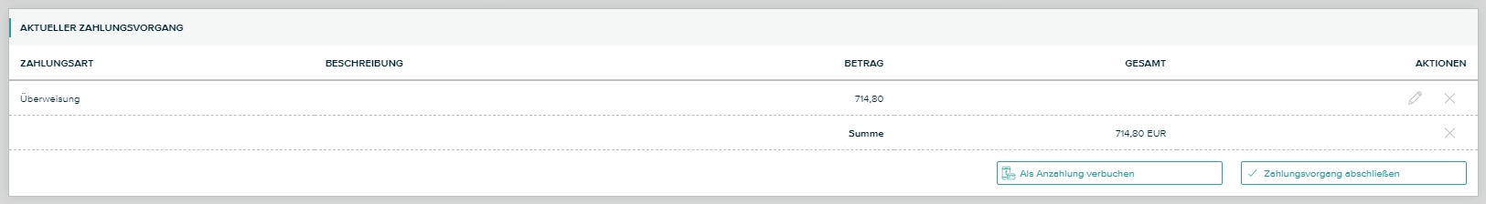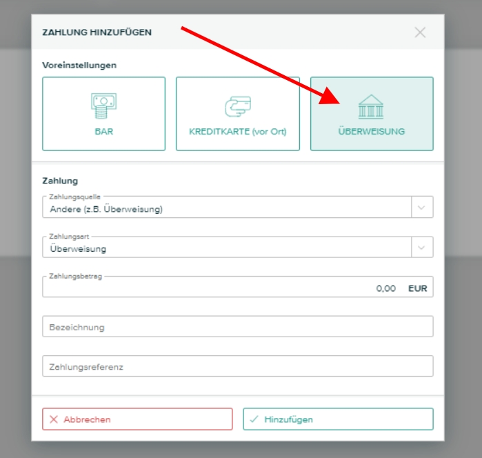 Wählen Sie die gewünschten Zahlungsart aus. Bei Bar, Kreditkarte (vor Ort) oder Überweisung können Sie einfach auf den unter Voreinstellung angezeigten Button klicken. Ansonsten wählen Sie die entsprechende Zahlungsquelle und Zahlungsart aus.