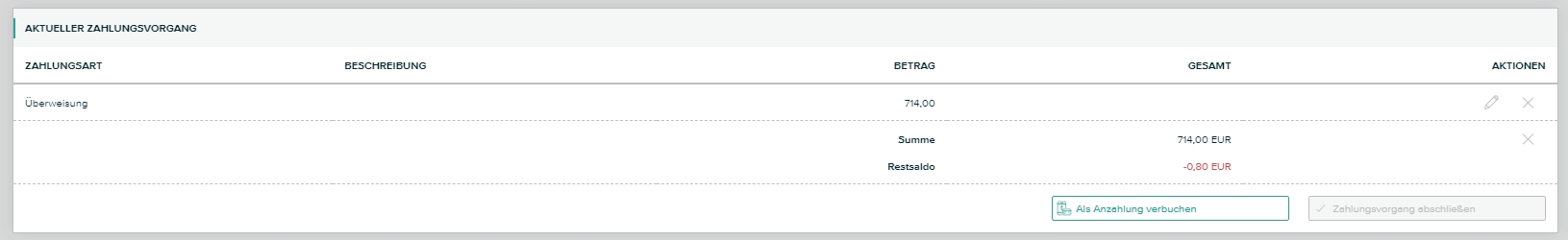 Der Gast erbringt eine Teilzahlung, wobei die Lieferung oder Leistung noch nicht erfolgt ist. Also die Zahlung enspricht nicht exakt der Summe der Leistungen, daher kann der Zahlungsvorgang zum jetzigen Zeitpunkt noch nicht abgeschlossen werden.