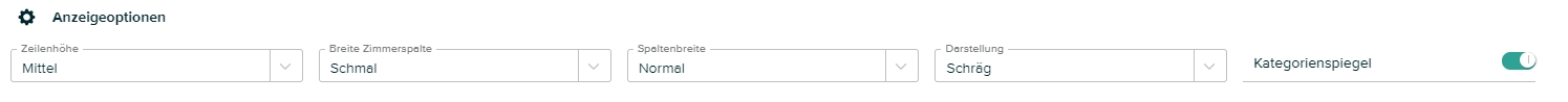 Am untersten Ende des Zimmerplans finden Sie folgende Anzeigeoptionen: - Zeilenhöhe - Breite Zimmerspalte (Breite der Zimmerspalte) - Spaltenbreite (Breite der Datumsspalte) - Darstellung (Reservierungsbalken schräg oder gerade) - Kategorienspiegel ( Ein- oder Ausblenden der Zeilen, in denen die freien Zimmer der jeweiligen Zimmerkategorie angezeigt werden)