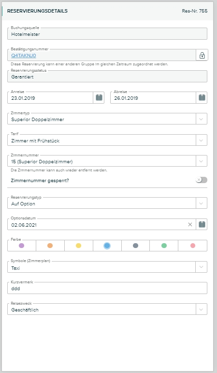 Hier können Sie An-Abreisedatum, Zimmertyp, Tarif und Zimmernummer ändern. Wenn Sie "Zimmernummer gesperrt" anklicken kann dieses Zimmer nicht mehr verschoben werden, falls ein Gast ein bestimmtes Zimmer wünscht. Desweiteren können der Reservierungstyp und der Reisezweck ausgewählt werden. Wenn Sie auf Option auswählen können Sie in der nächsten Zeile ein Optionsdatum eingeben, an welchem Sie am Tag des Optionsablaufs eine Benachrichtigung in der Hotelsoftware erhalten. Bei Auswahl einer Farbe, eines Symbols und Eingabe eines Kurzvermerks werden diese im Zimmerplan angezeigt.