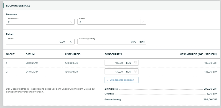 Hier können Sie einnen Rabatt eingeben . Unter Sonderpreis können Sie selbst den Preis ändern. Falls Sie diesen Preis auch auf die nachfolgenden Nächte übernehmen möchten, klicken Sie rechts daneben auf den Button mit den 2 Pfeilen.