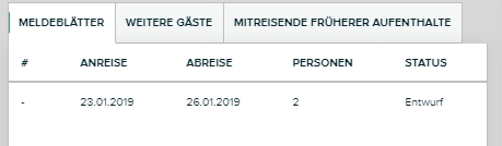 Hier können Sie die Daten für das Meldeblatt eingeben bzw. ergänzen. Außerdem können Sie weitere Mitreisende hinzufügen. Und falls bereits bei früheren Aufenthalten weitere Gäste mitgereist sind, werden die letzten 10 Mitreisenden in einem eigenen Tab angezeigt.