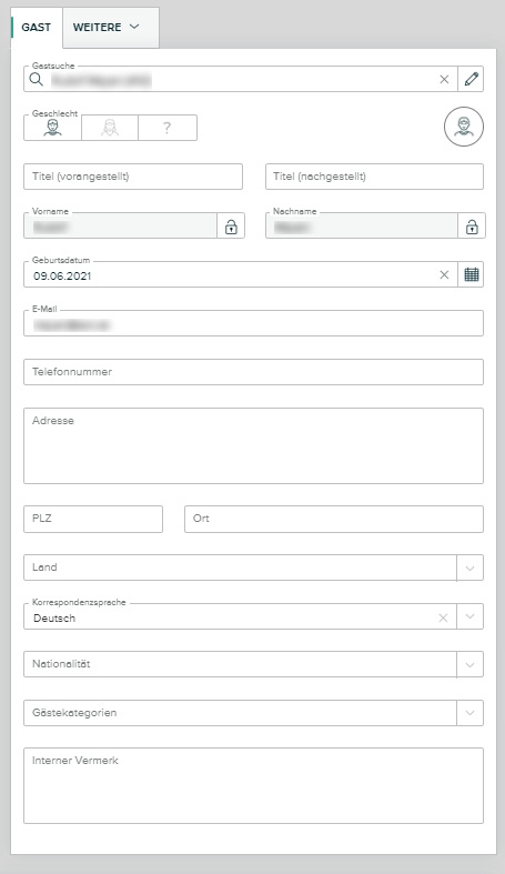 Hier können Sie die Gästeprofildaten ergänzen und bearbeiten. Unter weitere können Sie Firmen- oder Reisebüroprofile eingeben oder ergänzen.