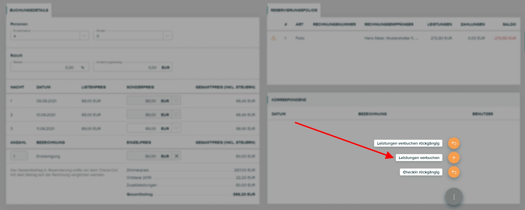 Wenn der Preis überprüft und bei Bedarf angepasst wurde, klicken Sie rechts unten auf den Button "Leistung verbuchen". Dadurch wird die zusätzliche Nacht auf das primäre Folio aufgebucht.
