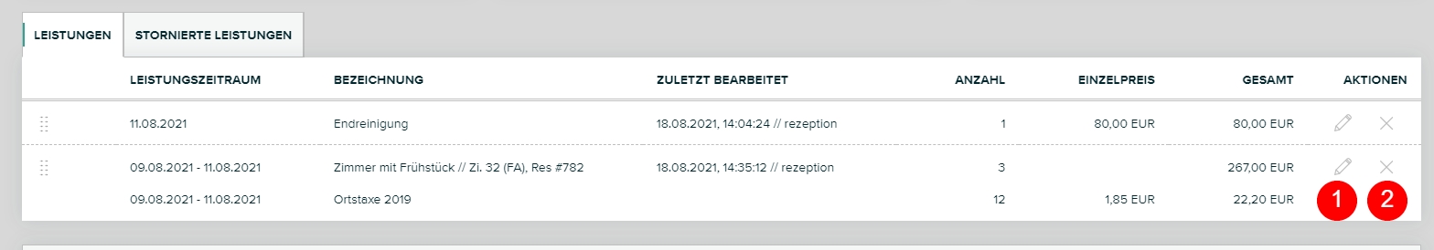 Im Folio können Sie nun entweder die Leistungen bearbeiten (Abbildung Punkt 1) oder stornieren (Abbildung Punkt 2).