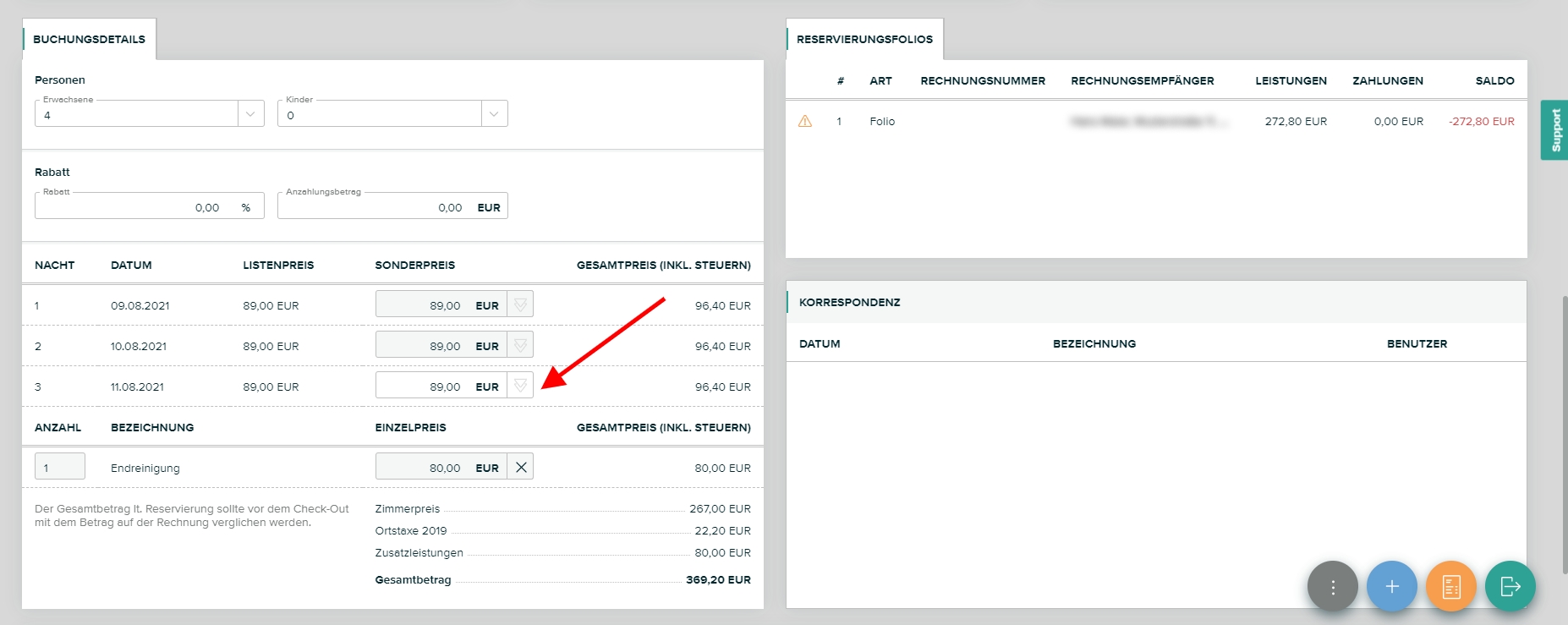 Wenn eine Reservierung bei einem bereits eingechecktem Gast verlängert wird, so wird die Verlängerungsnacht zuerst auf der Reservierung hinzugefügt, damit man den Preis noch bearbeiten kann.